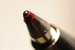 - L'encre aqueuse est également absorbée plus facilement par le papier que l'encre de stylo à bille et dans une moindre mesure que l'encre gélifiée, du fait de sa plus faible viscosité. L'encre aqueuse étant absorbée de manière continue par le papier, cela augmente les risques de taches en cas de pause.