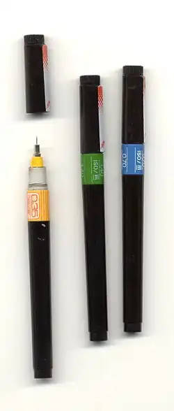 En Europe, les principaux fabricants, Faber-Castell, Rotring et Staedtler, fournissent des pointes présentées par épaisseurs selon les normes ISO, indiquées en millimètres : 0,13 mm, 0,18 mm, 0,25 mm, 0,35 mm, 0,5 mm, 0,7 mm, 1,0 mm, 1,5 mm et 2,0 mm, chaque fabricant avait ses propres normes et dimensions, exprimées en pouces. Une autre distinction existe entre les pointes destinées à être utilisées sur le papier et celles servant à tracer sur des films : celles-ci nécessitent une encre différente et la pointe est fabriquée en conséquence.