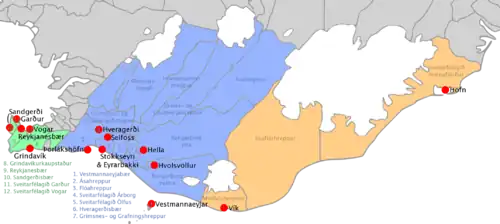 Hornafjörður, Skaftárhreppur, Mýrdalshreppur, Rangárþing eystra, Rangárþing ytra, Ásahreppur, Vestmannaeyjar, Flóahreppur, Árborg, Skeiða- og Gnúpverjahreppur, Hrunamannahreppur, Bláskógabyggð, Grímsnes- og Grafningshreppur, Hveragerði, Ölfus, Grindavíkurbær, Sandgerði, Garður, Reykjanesbær et Vogar