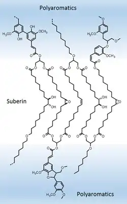 La subérine et la cutine sont des composés hautement hydrophobes qui entravent l'activité enzymatique des décomposeurs. Ces biopolymères sont proches l'un de l'autre par leur origine (biosynthèse qui partage des voies métaboliques communes, celle de la synthèse des acides gras et des phénylpropanoïdes (en)), leur constitution et leurs propriétés. La compréhension de leurs structures chimiques, leur biochimie et leurs fonctions soulève toujours des questions fondamentales non résolues[5].