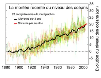 Pendant les 2500 ans du Subatlantique le niveau de la mer augmenta d'environ 1 mètre correspondant à un taux très bas de 0,4 millimètre par an. Depuis la fin du XIXe siècle la situation a changé drastiquement – pour la période entre 1880 et 2000 fut constatée une élévation de 22 centimètres avec un taux de 1,83 millimètre par an. Cette valeur fut encore dépassée durant les vingt dernières années, qui à elles seules enregistraient une hausse de 50 millimètres (mesures effectuées par satellite). Le taux récent est passé maintenant à 2,5 millimètres par an et est donc six fois plus important qu'au début du Subatlantique!