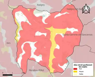 Le retrait-gonflement des sols argileux est susceptible d'engendrer des dommages importants aux bâtiments en cas d’alternance de périodes de sécheresse et de pluie. 83,3 % de la superficie communale est en aléa moyen ou fort (90 % au niveau départemental et 48,5 % au niveau national). Sur les 239 bâtiments dénombrés sur la commune en 2019, 217 sont en aléa moyen ou fort, soit 91 %, à comparer aux 83 % au niveau départemental et 54 % au niveau national. Une cartographie de l'exposition du territoire national au retrait gonflement des sols argileux est disponible sur le site du BRGM[14],[Carte 2].