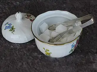 Le sucre en morceaux, parfois appelé pierres de sucre[1], est du sucre présenté sous forme de morceaux, le plus souvent des parallélépipèdes rectangles. Il est utilisé pour sucrer les boissons chaudes telles que le café, le thé ou les tisanes : la taille normalisée des morceaux permet d'apprécier la quantité de sucre que l'on met dans la boisson. À titre hygiénique, les morceaux de sucre peuvent être emballés individuellement pour la consommation dans les débits de boissons, les cantines, etc. La pince à sucre, autrefois répandue, permet de saisir un morceau dans le sucrier.