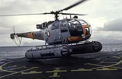 - La Force maritime de l'aéronautique navale[12] a commandé trente-sept SA-316B, SA-316B VSV et SA-319B (sauvetage en mer, liaison, formation des équipages embarqués, lutte ASM). Les premiers SA-316B ont été affectées aux escadrilles 20S (Saint Raphaël 1962-1991), 22S (recréée en 1964 à Lanvéoc-Poulmic qui a fourni notamment les détachements PEDRO des porte-avions français alors basés à Brest), 23S (Saint-Mandrier 1962-1999 qui a fourni notamment les détachements PEDRO aux porte-avions Foch et Clemenceau basés ensuite à Toulon). En 1972, la 22S a reçu les SA.316B VSV pour assurer la formation des équipages, devenant ainsi en 1976 l'ESHE (École de spécialisation sur hélicoptères embarqués). L'arrivée en 1974 des SA-319B équipés de deux torpilles Mk-46 a permis de constituer les flottilles de lutte ASM 34F (Saint Raphaël 1974 puis Lanvéoc-Poulmic) et 35F (Saint-Mandrier 1979, Lanvéoc-Poulmic 1979-1998, Saint-Mandrier 1999-2003, Hyères-Le Palyvestre) faisant de l'Alouette III le premier hélicoptère de lutte ASM à embarquer sur les frégates de type Tourville. Les missions ASM sont ensuite reprises au sein de l'aéronautique navale par les WG-13 Lynx et AS-565 Panther (les Alouette III de la flottille 34F sont définitivement remplacées en 1980 par des WG-13 Lynx et les missions de la flottille 35F évoluent à partir de 1991 vers le soutien et le sauvetage en étant recréée en 1999 par la fusion de la flottille 33F et de l'escadrille 23S). Les missions PEDRO et SAR sont ensuite reprises progressivement au sein des unités par les SA-365F Dauphin Pedro et AS-365N Dauphin SP cantonnant ainsi respectivement les dernières Alouette III de la flottille 35F et de l'escadrille 22S à des missions de soutien et de formation. 13 SA-319 encore en service dans l'aéronautique navale en 2016. a marqué le dernier vol des SA316B dans l’Aéronautique navale. En 2020, une seule, immatriculé 997 de l'Escadrille 22S, dispose d'un radar de recherche Thales OMERA ORB-32[13]. Le dernier embarquement opérationnel d’une Alouette III sur un navire de la Marine Nationale a lieu au premier trimestre 2022, à bord de la Marne. Le retrait des 8 exemplaires dont 5 encore en service actif est prévu[14] le [15].