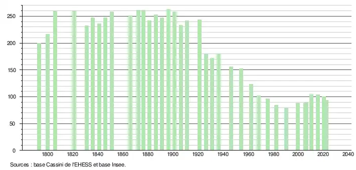L'évolution du nombre d'habitants est connue à travers les recensements de la population effectués dans la commune depuis 1793. Pour les communes de moins de 10 000 habitants, une enquête de recensement portant sur toute la population est réalisée tous les cinq ans, les populations de référence des années intermédiaires étant quant à elles estimées par interpolation ou extrapolation[23]. Pour la commune, le premier recensement exhaustif entrant dans le cadre du nouveau dispositif a été réalisé en 2005[24].