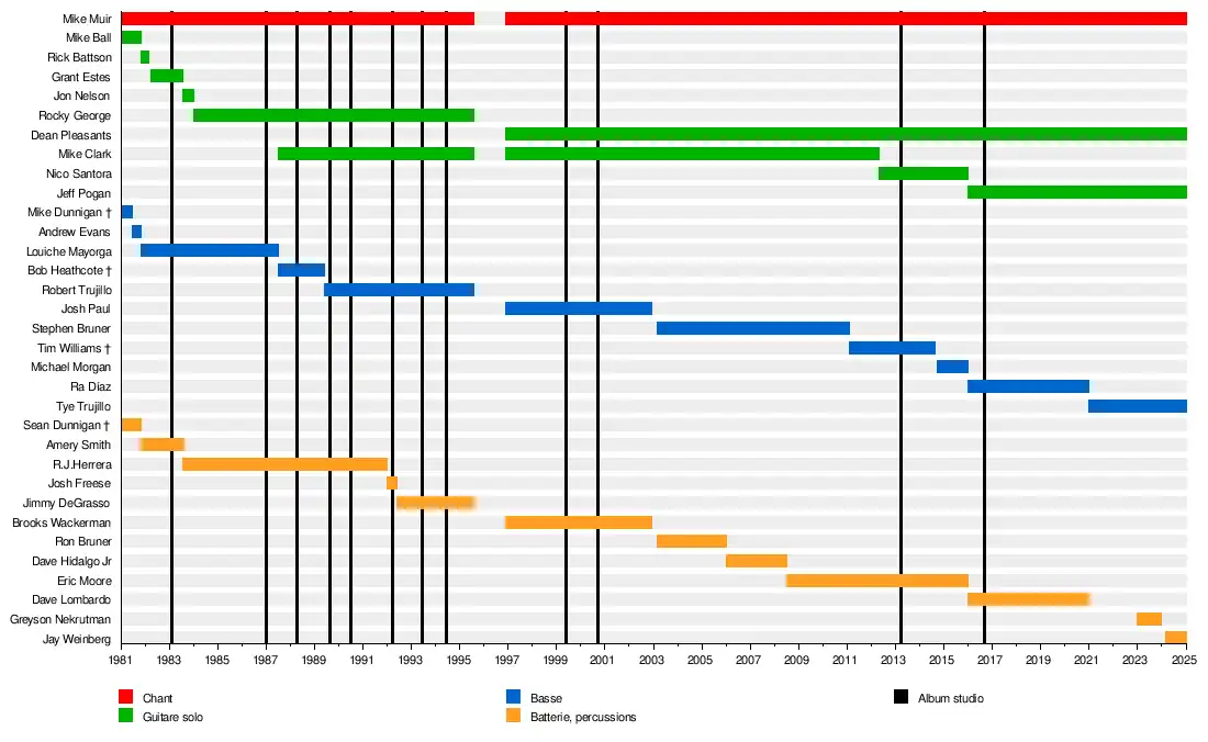 Mike Clark Mike Ball Rick Battson Ron Bruner Ric Clayton Jimmy DeGrasso Mike Dunnigan Sean Dunnigan Carlos Egert Grant Estes Andrew Evans Josh Freese Rocky George Bob Heathcote † R.J. Herrera Dave Hidalgo Louiche Mayorga Jon Nelson Josh Paul Greg Saenz Amery Smith Jason Speir Robert Trujillo Brooks Wackerman Stephen « Thundercat » Bruner Tim « RAWBIZ » Williams † Thomas Pridgen Dave Lombardo |