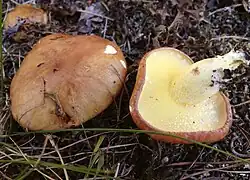 Le Bolet à base rose (Suillus collinitus)[11], qui a un chapeau fibrilleux plus marron et un mycélium rose. Comestible jeune, bien cuit, en quantité limitée, après évaluation de sa tolérance aux effets laxatifs.