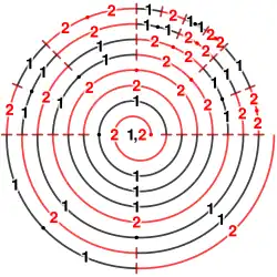 la suite formée des longueurs successives de ces plages redonne la suite de départ : 1,2,2,1,1,2,1,... ; c'est la seule suite à deux symboles 1 et 2 ayant cette propriété et commençant par un 1[3],[4].