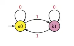 est égal à la somme, modulo 2, des chiffres dans le développement binaire de . Par exemple, , et donc . Ce calcul est réalisé par l'automate de Prouhet-Thue-Morse : partant de l'état initial, on suit les transitions indiquées par les bits du développement binaire. L'état d'arrivée, selon qu'il est jaune ou rose, indique que la valeur de la suite est 0 ou 1. Pour , on obtient :