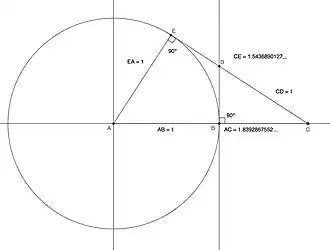 Dans la figure ci-contre, posant , on a , donc, posant , on a , sachant . En éliminant , on obtient , ce qui montre que la constante de Tribonacci est égale à la longueur .