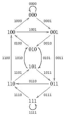 Chaque arc de ce graphe est formé de quatre bits : les trois premiers sont l'étiquette du sommet de départ, les trois derniers ceux du sommet d'arrivée. Voici un chemin eulérien du graphe (écrit sur deux lignes).