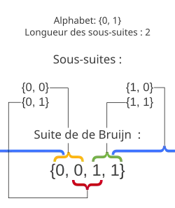 Une suite de de Bruijn généralisée avec les paramètres est une suite cyclique de bits telle que chaque facteur de longueur figure au plus fois[21]. Une telle suite est dite équilibrée si elle contient autant de 0 que de 1.