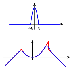 La façon la plus simple de construire une suite régularisante[6] est de partir d'une fonction régularisante, c.-à-d.[7] une fonction , C∞ à support compact, positive et d'intégrale 1 (sur ℝd), et de poser[8] .