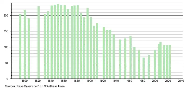 L'évolution du nombre d'habitants est connue à travers les recensements de la population effectués dans la commune depuis 1793. Pour les communes de moins de 10 000 habitants, une enquête de recensement portant sur toute la population est réalisée tous les cinq ans, les populations de référence des années intermédiaires étant quant à elles estimées par interpolation ou extrapolation[40]. Pour la commune, le premier recensement exhaustif entrant dans le cadre du nouveau dispositif a été réalisé en 2008[41].