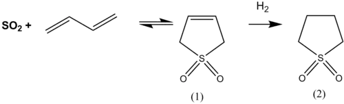 La synthèse originale mise au point par Shell consistait à faire réagir du dioxyde de soufre SO2 sur du butadiène H2C=CH–CH=CH2 pour donner du sulfolène, réaction suivie d'une hydrogénation au nickel de Raney pour donner le sulfolane[3] :