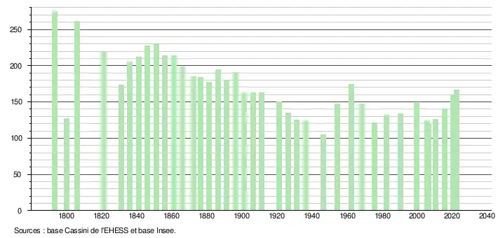 L'évolution du nombre d'habitants est connue à travers les recensements de la population effectués dans la commune depuis 1793. Pour les communes de moins de 10 000 habitants, une enquête de recensement portant sur toute la population est réalisée tous les cinq ans, les populations de référence des années intermédiaires étant quant à elles estimées par interpolation ou extrapolation[25]. Pour la commune, le premier recensement exhaustif entrant dans le cadre du nouveau dispositif a été réalisé en 2005[26].