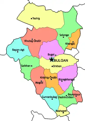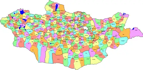 La Mongolie est divisée en 21 aïmags (provinces), eux-mêmes partagés en sums (districts). Il existe au total 315 sums.
