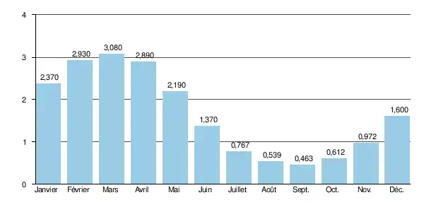Par contre les crues sont fort peu importantes. Les QIX 2 et QIX 5 valent respectivement 3,8 et 5,3 m3/s. Le QIX 10 vaut 6,3 m3/s, tandis que le QIX 20 se monte à 7,3 m3/s. Enfin le QIX 50 ne vaut pas plus de 8,6 m3/s.