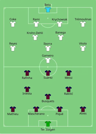 Le match est remporté par le FC Barcelone après prolongation, sur le score de 5 buts à 4.