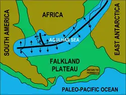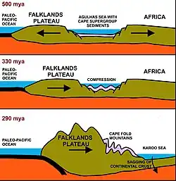 La figure du haut dépeint la situation il y a 510 Ma, avec les sédiments remplissant la mer d'Agulhas. La figure du milieu montre le plateau des Falklands dérivant vers le nord et fermant la mer d'Agulhas en plissant les sédiments. L'illustration du bas montre comment la subduction de la plaque paléo-Pacifique sous le plateau des Falklands, au début du Permien, fait surgir une importante chaîne de montagnes. Ces dernières se sont érodées, formant le « groupe de Beaufort ».