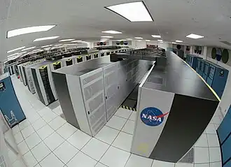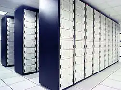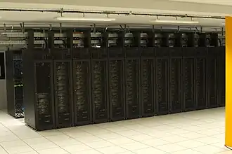 - des composants électroniques rapides (structure de type serveurs lame utilisant des processeurs multi-cœur ou des cartes graphiques dédiées au calcul scientifique de dernière génération, de la mémoire vive et des équipements de stockage de masse — disque dur — reliés à la fibre optique en grande quantité, etc.) associés à un système d'exploitation dédié (comme Linux, majoritairement utilisé actuellement[9]).