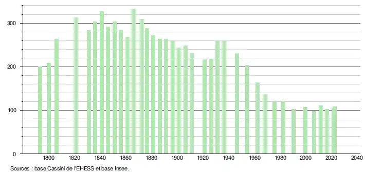 L'évolution du nombre d'habitants est connue à travers les recensements de la population effectués dans la commune depuis 1793. Pour les communes de moins de 10 000 habitants, une enquête de recensement portant sur toute la population est réalisée tous les cinq ans, les populations de référence des années intermédiaires étant quant à elles estimées par interpolation ou extrapolation[14]. Pour la commune, le premier recensement exhaustif entrant dans le cadre du nouveau dispositif a été réalisé en 2006[15].