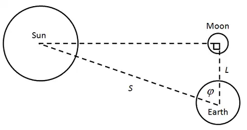 Le diagramme est fortement exagéré ; en réalité, S = 390 L, et φ est extrêmement proche de 90°. Aristarque estime que φ est inférieur d'un trentième de quadrant (3°) à l'angle droit, c'est-à-dire qu'il mesure 87°. Bien que les fonctions trigonométriques n'aient pas encore existé, en utilisant une analyse géométrique à la façon d'Euclide, Aristarque détermine que