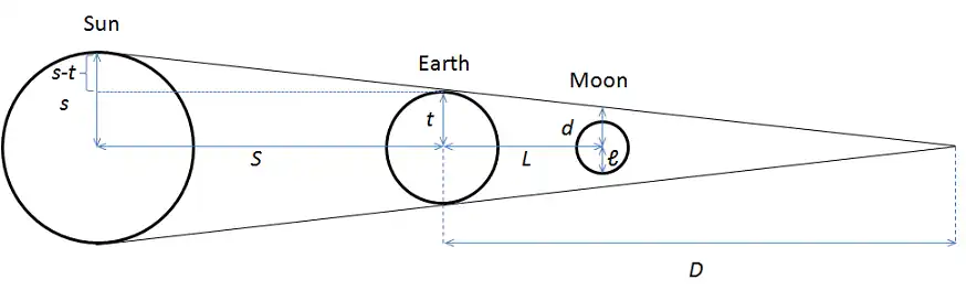 En divisant ces deux équations, et en utilisant l'observation que les tailles apparentes du Soleil et de la Lune sont identiques, , on obtient