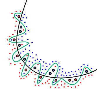 Si l'on autorise un ensemble de fonctions d'apprentissage plus grand, par exemple l'ensemble des fonctions polynomiales à coefficients réels, il est possible de trouver un modèle décrivant parfaitement les données d'apprentissage (erreur d'apprentissage nulle). C'est le cas du polynôme d'interpolation de Lagrange : il passe bien par tous les points verts mais n'a visiblement aucune capacité de généralisation.