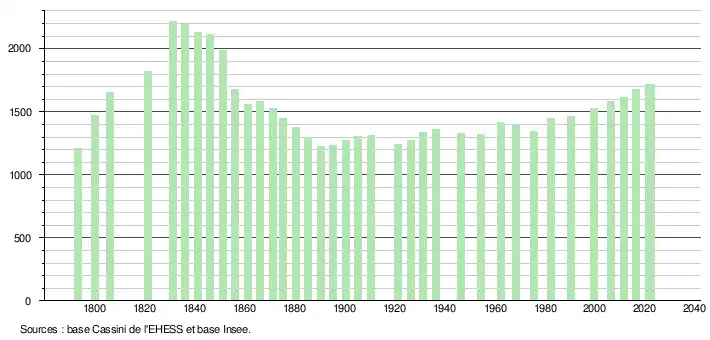 L'évolution du nombre d'habitants est connue à travers les recensements de la population effectués dans la commune depuis 1793. Pour les communes de moins de 10 000 habitants, une enquête de recensement portant sur toute la population est réalisée tous les cinq ans, les populations de référence des années intermédiaires étant quant à elles estimées par interpolation ou extrapolation[22]. Pour la commune, le premier recensement exhaustif entrant dans le cadre du nouveau dispositif a été réalisé en 2006[23].