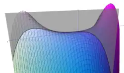 Chaque fois que la surface est intersectée par un plan vertical passant par l'origine, la courbe résultante dans le plan d'intersection a un maximum local en ce point[1]. En termes plus paradoxaux, si on déplace un point de l'origine sur une ligne droite quelconque, la fonction diminue au début du déplacement ; néanmoins, le point n'est pas un maximum local de la fonction, car se déplacer le long d'une parabole comme entraîne une croissance de cette fonction.