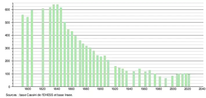 L'évolution du nombre d'habitants est connue à travers les recensements de la population effectués dans la commune depuis 1793. Pour les communes de moins de 10 000 habitants, une enquête de recensement portant sur toute la population est réalisée tous les cinq ans, les populations de référence des années intermédiaires étant quant à elles estimées par interpolation ou extrapolation[21]. Pour la commune, le premier recensement exhaustif entrant dans le cadre du nouveau dispositif a été réalisé en 2008[22].