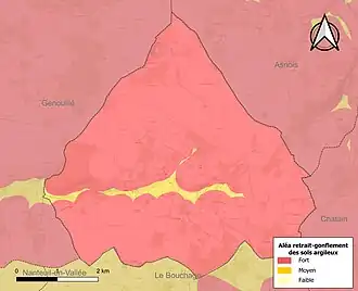 Les mouvements de terrains susceptibles de se produire sur la commune sont des affaissements et effondrements liés aux cavités souterraines (hors mines) et des tassements différentiels[16]. Afin de mieux appréhender le risque d’affaissement de terrain, un inventaire national permet de localiser les éventuelles cavités souterraines sur la commune[17]. Le retrait-gonflement des sols argileux est susceptible d'engendrer des dommages importants aux bâtiments en cas d’alternance de périodes de sécheresse et de pluie[18]. La totalité de la commune est en aléa moyen ou fort (79,5 % au niveau départemental et 48,5 % au niveau national)[Carte 2]. Depuis le , en application de la loi ÉLAN, différentes contraintes s'imposent aux vendeurs, maîtres d'ouvrages ou constructeurs de biens situés dans une zone classée en aléa moyen ou fort[Note 1],[19].