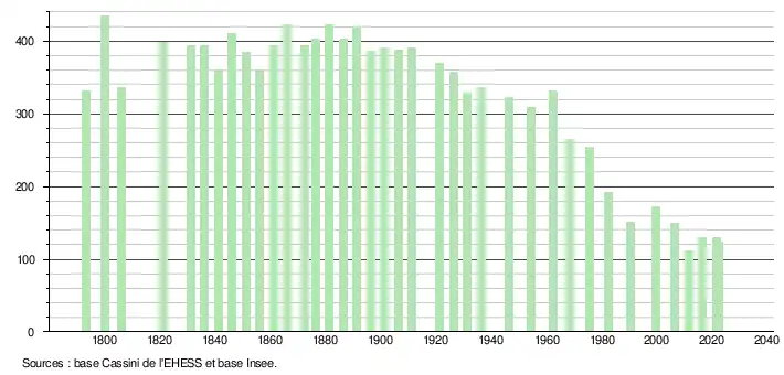 L'évolution du nombre d'habitants est connue à travers les recensements de la population effectués dans la commune depuis 1793. Pour les communes de moins de 10 000 habitants, une enquête de recensement portant sur toute la population est réalisée tous les cinq ans, les populations de référence des années intermédiaires étant quant à elles estimées par interpolation ou extrapolation[22]. Pour la commune, le premier recensement exhaustif entrant dans le cadre du nouveau dispositif a été réalisé en 2006[23].