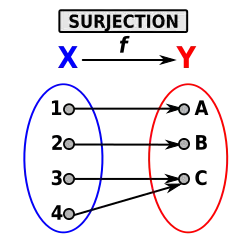 Une application f de X dans Y est dite surjective si pour tout élément y de Y, il existe au moins un élément x de X tel que y = f(x), ce qui s'écrit formellement :