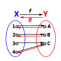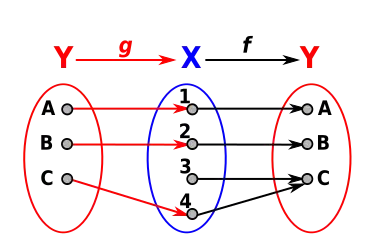 Soit f une application de X dans Y. Si f est « inversible à droite », c'est-à-dire[2] s'il existe une application g de Y dans X telle que la fonction composée f∘g soit égale à l'application identité sur Y, alors f est surjective (d'après une propriété vue plus haut).