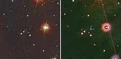 La contrepartie optique du sursaut gamma GRB990123, image prise par le télescope spatial Hubble le , d'une intensité exceptionnelle débouche sur l'hypothèse d'un faisceau de rayonnement étroit.