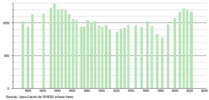 L'évolution du nombre d'habitants est connue à travers les recensements de la population effectués dans la commune depuis 1793. Pour les communes de moins de 10 000 habitants, une enquête de recensement portant sur toute la population est réalisée tous les cinq ans, les populations de référence des années intermédiaires étant quant à elles estimées par interpolation ou extrapolation[38]. Pour la commune, le premier recensement exhaustif entrant dans le cadre du nouveau dispositif a été réalisé en 2006[39].