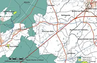 Carte de la commune de Sury-aux-Bois et des communes limitrophes.