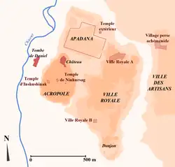 - ↑ Présentation de la topographie et des monuments de Suse à l'époque achéménide, avec une iconographie très fournie : R. Boucharlat, « Suse », sur ACHEMENET, 2013-2014