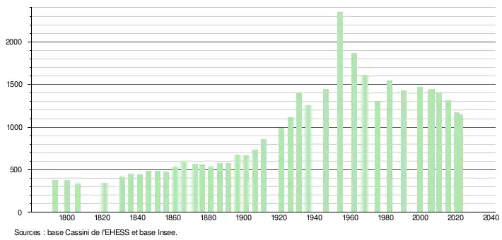 L'évolution du nombre d'habitants est connue à travers les recensements de la population effectués dans la commune depuis 1793. Pour les communes de moins de 10 000 habitants, une enquête de recensement portant sur toute la population est réalisée tous les cinq ans, les populations de référence des années intermédiaires étant quant à elles estimées par interpolation ou extrapolation[22]. Pour la commune, le premier recensement exhaustif entrant dans le cadre du nouveau dispositif a été réalisé en 2005[23].