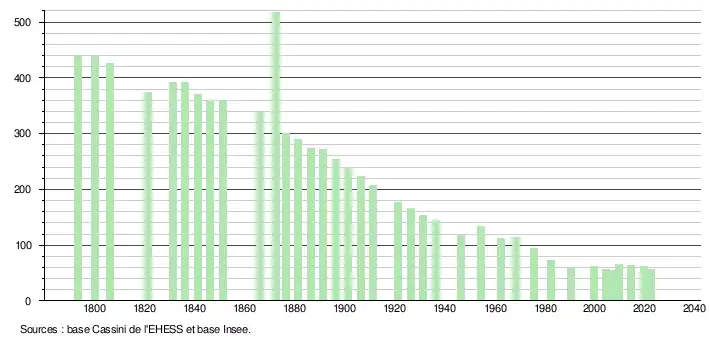 L'évolution du nombre d'habitants est connue à travers les recensements de la population effectués dans la commune depuis 1793. Pour les communes de moins de 10 000 habitants, une enquête de recensement portant sur toute la population est réalisée tous les cinq ans, les populations de référence des années intermédiaires étant quant à elles estimées par interpolation ou extrapolation[19]. Pour la commune, le premier recensement exhaustif entrant dans le cadre du nouveau dispositif a été réalisé en 2004[20].