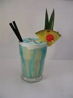 | Décoration / garniture | Effets de curaçao bleu sur la crème de noix de coco, tranche d'ananas, cerise confite |