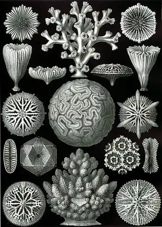 La symétrie d'ordre 6 (« hexamérique ») se retrouve chez de nombreux cnidaires, en particulier dans le groupe des Hexacorallia, qui regroupe les anémones de mer, coraux récifaux et certains autres groupes comme les coraux noirs. Cette symétrie est cependant peu visible à l’œil nu, d'abord parce que les rayons sont souvent subdivisés chez ces animaux, qui se contentent rarement de 6 tentacules, et ensuite parce que cette symétrie touche essentiellement les polypes, souvent minuscules et pouvant former des colonies massives et le plus souvent non géométriques.