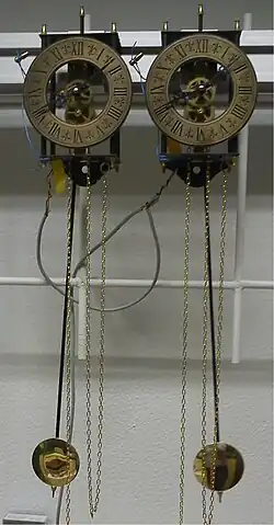 En 1665, Christian Huygens se penche sur le problème de la mesure de la longitude. Il associe deux horloges à pendule identiques afin d'avoir une redondance susceptible de garantir fiabilité et précision. Une maladie le clouant ensuite au lit, il découvre que les deux pendules identiques placés l'un à côté de l'autre battent en opposition. Si l'on perturbe ce synchronisme, le couplage reprend ses droits environ trente minutes plus tard. Il décrit le phénomène dans la correspondance avec son père[1], et en fait part à son ami René-François de Sluse, qualifiant de « sympathie » le lien entre les deux horloges. Huygens attribue initialement ce synchronisme au déplacement des masses d'air puis, analysant expérimentalement le phénomène en accrochant ses pendules à une barre en bois, il l’explique par la transmission des efforts dans leur châssis commun[2], bien qu'il l'ait conçu pour être rigide et qu'il l'ait lourdement lesté[1].