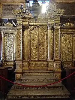 L'arche présente une structure tripartite : la section centrale abrite la niche pour les rouleaux de Torah, surmontée d'un fronton brisé baroque et flanquée de deux piliers carrés et de deux colonnes corinthiens cannelées. Les deux sections latérales comportent des sièges pour les parnassim avec des dossiers ornés et courbés, couronnés de petits frontons brisés et encadrés de chaque côté par des colonnes corinthiennes avec des cannelures obliques et verticales[25]. Les marches en marbre qui mènent au placard portent une inscription obscure en hébreu, qui se lit :