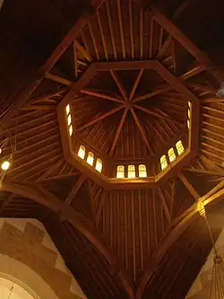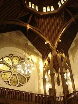 Les vitraux en verre coloré des grandes rosaces ainsi que des fenêtres à arc plein cintre situées sous les rosaces ou de part et d'autre des rosaces donnent un éclairage naturel aux couleurs chaudes parfaitement en harmonie avec les murs en pierre et les boiseries. Des chandeliers, des lustres et des appliques dont la forme des verrines a été spécialement dessinée par l'architecte, complètent cet éclairage.