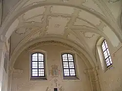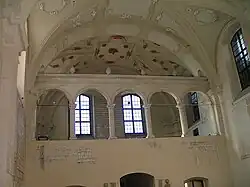 Sur le mur Est, des deux côtés de l'Arche sainte, se trouvent deux petits cartouches avec les inscriptions lisibles de la bénédiction sacerdotale, et à droite la peinture d'une menorah (chandelier à sept branches) qui ont été probablement peints vers le milieu du XVIIe siècle. Sur le côté gauche, se trouvaient initialement le dessin des douze pains d'alliance[3], représentant les douze tribus d'Israël. La synagogue d'Isaac est l'une des rares synagogues de Pologne où la pièce réservée aux femmes est décorée de textes polychromes, certainement présents de femmes fortunées. Sur la longueur de la salle de prières, se trouvent des pilastres doubles supportant une voûte arquée.
