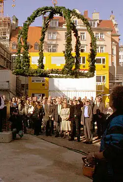 Comme prévu initialement, la fête de l'achèvement du gros-œuvre se déroule le . Le début de la construction avait été retardé à plusieurs reprises, en raison de la découverte, lors du creusement des fondations, de vestiges du Moyen Âge ayant nécessité des fouilles complémentaires.