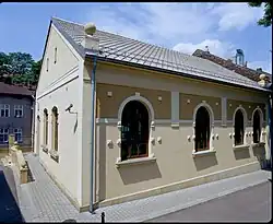 La synagogue possède des fenêtres irrégulièrement espacées, celles situées sur les murs est et ouest sont à arc plein-cintre et celles sur le mur sud sont à arc en anse de panier. Le bâtiment est recouvert d'un toit à deux versants.